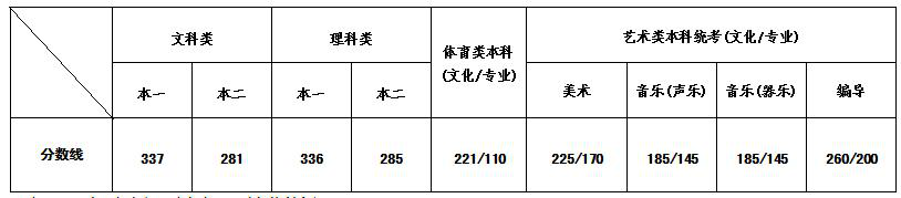 注:一、艺术类校考本科专业录取最低控制分数线: 1.独立设置本科艺术院校及参照独立设置本科艺术院校招生的院校(沈阳音乐学院、上海戏剧学院、湖北美术学院、中央民族大学、中央美术学院除外,下同)艺术类本科专业的录取最低控制分数线由各校自行划定。 2.除独立设置本科艺术院校和参照独立设置本科艺术院校招生的院校以外的其他院校本科校考专业的省最低控制分数线:文化185分/专业合格。其中,取得音乐表演、音乐学、作曲与作曲技术理论、广播电视编导、美术学、绘画、雕塑、中国画、实验艺术、艺术设计学、视觉传达设计、环境设计、产品设计、服装与服饰设计、公共艺术、工艺美术、数字媒体艺术、艺术与科技、陶瓷艺术设计专业校考合格的考生,还须参加相应专业省统考,且美术省统考成绩须达到160分,音乐省统考成绩须达到120分,编导省统考成绩须达到190分。 二、第一阶段填报志愿资格线: 1.文科类、理科类考生必测科目要求为4C1合格,选测科目等级符合院校的要求,文科类总分在271分以上、理科类总分在275分以上,方可填报第一阶段高考志愿(报考高水平运动队考生、飞行学员、少数民族预科班除外)。 2.体育类、艺术类考生七门必测科目等级中D级不超过3门,体育类文化211分/专业100分以上、美术省统考文化215分/专业160分以上、音乐省统考(声乐、器乐)文化175分/专业135分以上、编导省统考文化250分/专业190分以上、艺术校考文化175分/专业合格(报考独立设置本科艺术院校及参照独立设置本科艺术院校招生的院校艺术类本科专业不受此限制),方可填报第一阶段高考志愿。 |